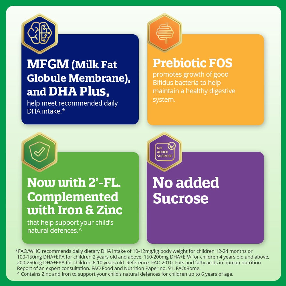 - 2'-FL + Prebiotic Inulin -With 2'-FL. Complemented with Iron and Zinc that help support your child's natural defenses. -Prebiotic (Inulin) helps support growth of beneficial bacteria/ good intestinal flora in the gut.