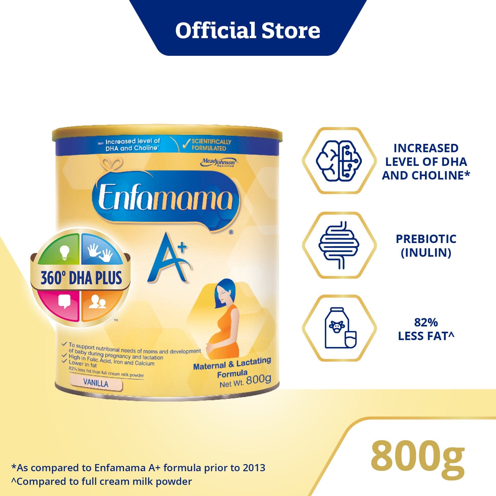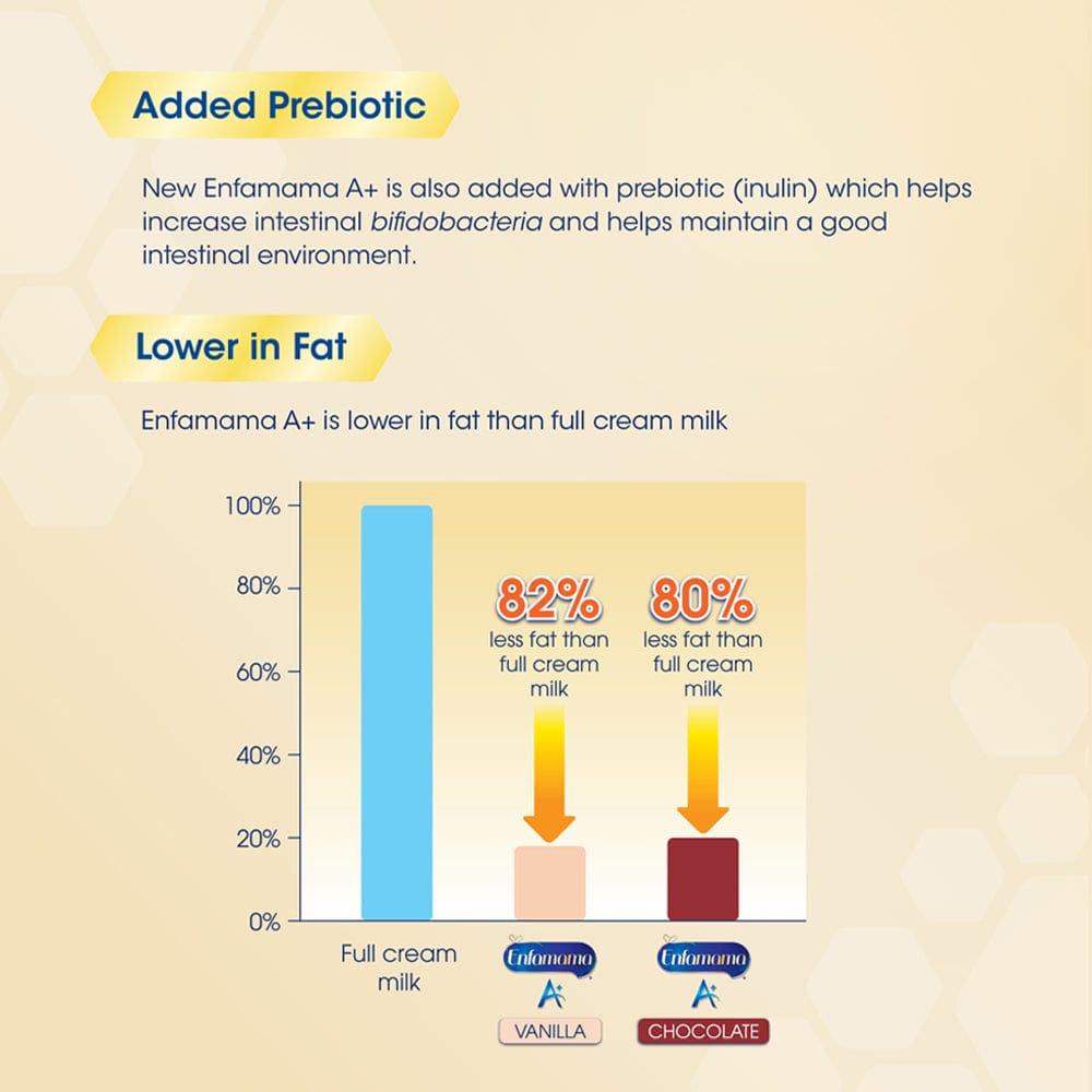 80% less fat^ for Enfamama A+ Chocolate and 82% less fat^ for Enfamama A+ Vanilla.