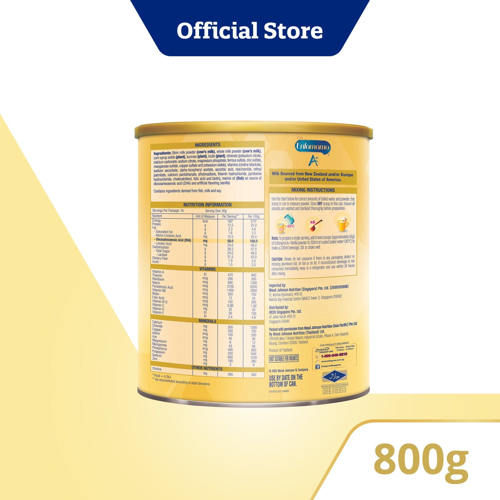 Increased level of DHA and Choline▴. DHA and Choline are found in breastmilk. Enfamama A+ provides 100mg DHA in 2 servings a day which helps meet recommendations* for daily DHA intake. ■