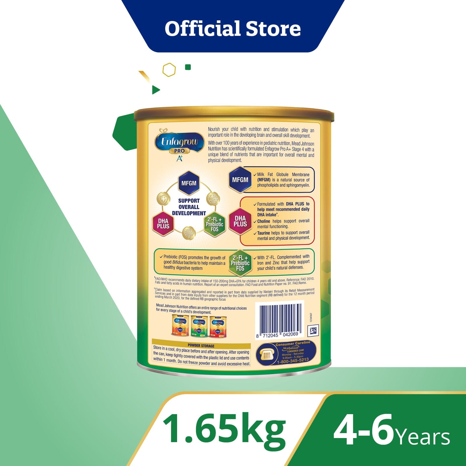 - With over 100 years of experience in pediatric nutrition, Mead Johnson Nutrition has scientifically formulated EnfagrowPro A+ Stage 4 with a unique blend of nutrients that are important for overall mental and physical development.